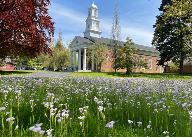 We have a center aisle, a good sound system, and a easy to access sanctuary. In the spring, the field in front of the sanctuary makes for a lovely picture looking to the sanctuary.